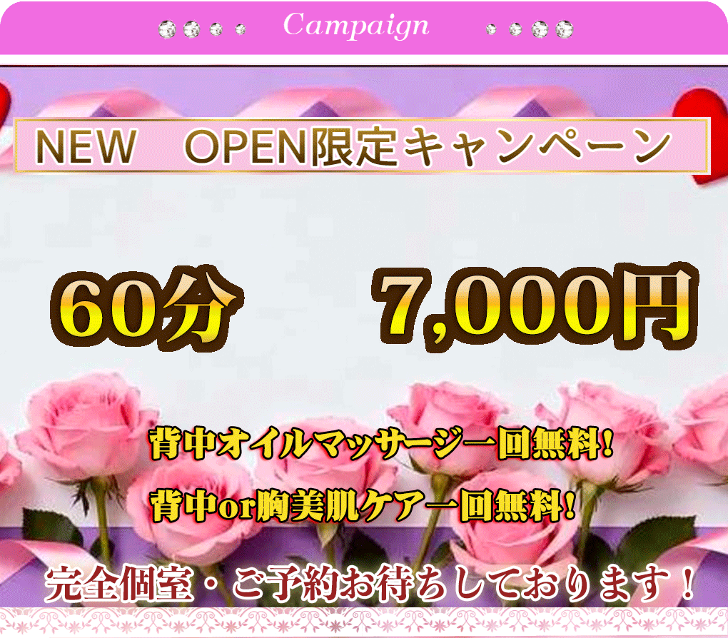疲れた体にちょっとごほうび…貴方の癒しの時間は当店と共に… 日々都会の幻想と毎日の仕事に追われ疲れを溜めたりしていませんか? そんな時は粋な音楽を聞き素敵なセラピストにマッサージされ、 まったりと大人のムードに浸る癒しの時間なんていかがでしょうか? 本日も皆様のお越しを従業員一同心よりお待ち致しております♪